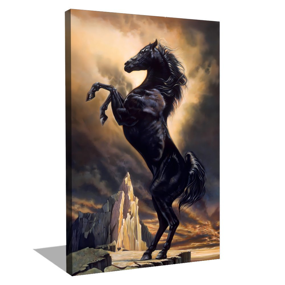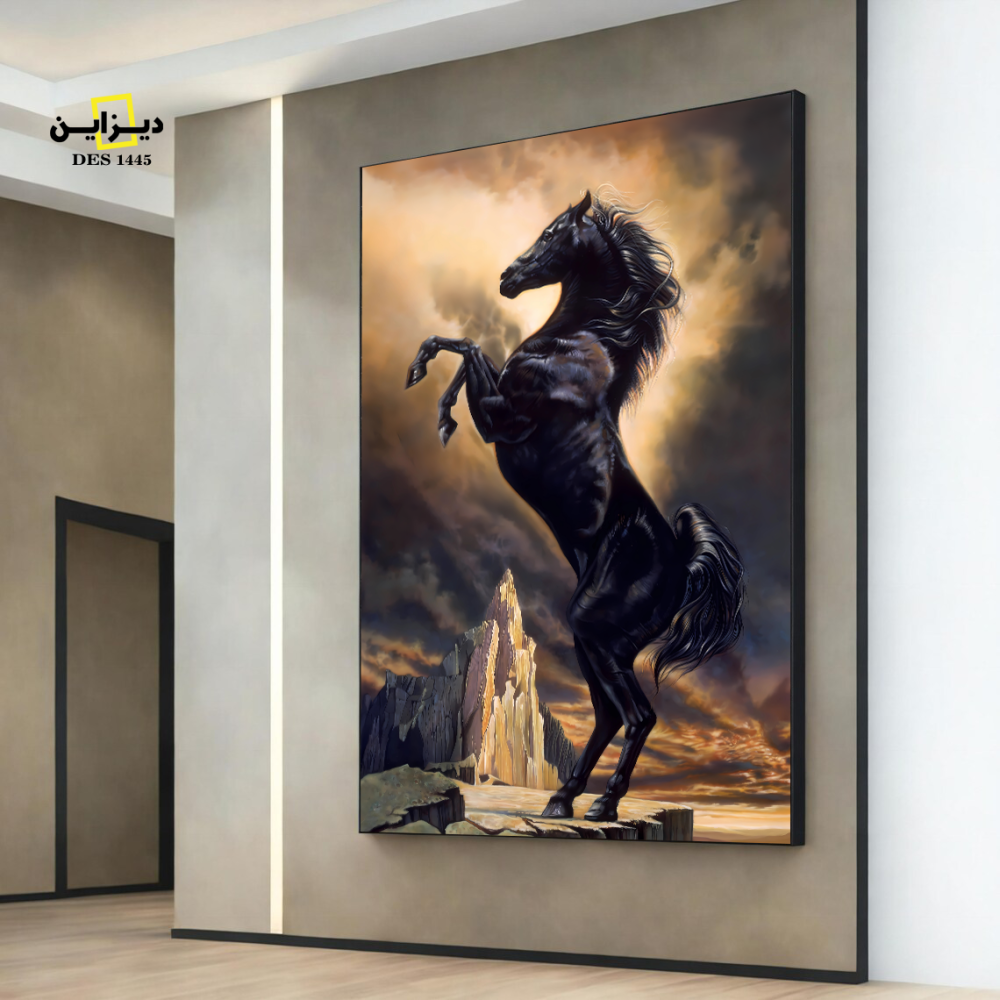 اجعل الجمال يحيط بك في كل مكان، واستمتع بمشاهدة "لوحة فنية خيل أسود مطبوعة" تأخذك في رحلة إلى عالم من الألوان والجمال الأسود.